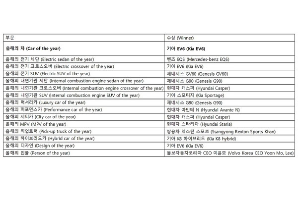 And the category winners are as follows: △EV Sedan: Mercedes-Benz the New EQS, △Internal Combustion Engine Sedan: Genesis G90, △EV Crossover: Kia EV6, △Internal Combustion Engine Crossover: Hyundai Casper, △EV SUV: Genesis GV60, △Internal Combustion Engine SUV: Kia Sportage.