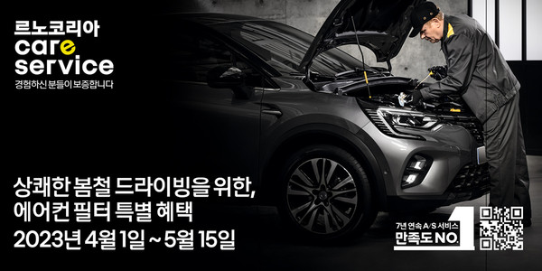 르노코리아자동차는 본격적인 나들이 시즌을 맞아 다음 달 15일까지 에어컨필터와 합성엔진오일을 각각 최대 25%, 15% 할인된 가격에 제공하는 특별 행사를 진행한다고 10일 밝혔다.