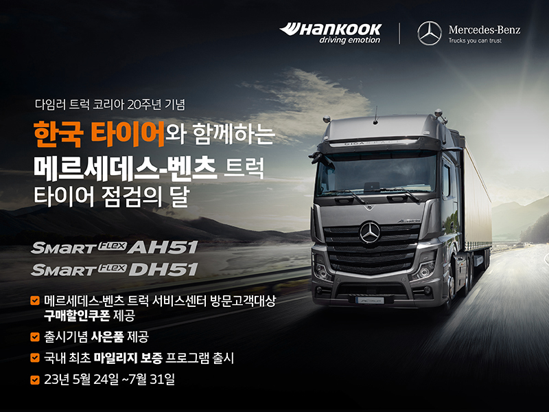 한국타이어는 행사기간동안 다임러트럭코리아가 운영하는 전국 16개 메르세데스벤츠트럭 서비스센터를 방문하는 메르세데스벤츠 상용차 소유자에게 중대형 카고트럭용 타이어 스마트플렉스 AH51과 스마트플렉스 DH51 할인쿠폰을 증정한다. 2개 구매 시 2만원, 4개 구매 시 4만원까지 할인혜택을 제공한다.