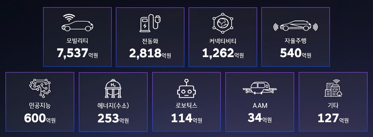 현대차그룹이 투자한 스타트업 사업 분야는 모빌리티 서비스 분야를 비롯해 전동화, 커넥티비티, 인공지능, 자율주행, 에너지, 로보틱스 등 미래 신사업 영역을 망라한다. 분야별로 보면 모빌리티 분야가 7537억원으로 가장 많고, 전동화 2818억원, 커넥티비티 1262억원, 인공지능 600억원, 자율주행 540억원, 에너지 253억원, 로보틱스 114억원 순이다.