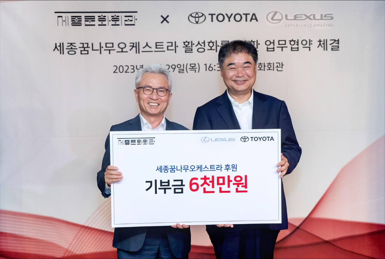 한국토요타자동차가 세종문화회관과 '아동, 청소년 예술교육 활성화를 위한 업무협약'을 체결하고 후원금 6000만원을 전달했다.