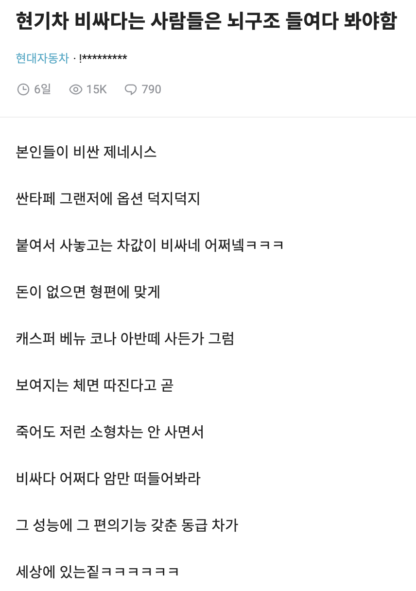 현대자동차 직원으로 보이는 누군가가 직장 커뮤니티 사이트에 올린 "현기차 비싸다는 사람들은 뇌구조 들여다 봐야함"이라는 글을 뒤늦게 봤다.(그의 진심이 담기기를 바라는 마음에 교정없이 게시된 글을 그대로 옮긴다). 그는 "제네시스, 싼타페, 그랜저에 옵션 덕지덕지 붙여서 사놓고는 차값이 비싸네 어쩌넼ㅋㅋㅋ"라며 "돈이 없으면 형편에 맞게 캐스퍼, 베뉴, 코나, 아반떼 사든가 그럼"이라고 했다.