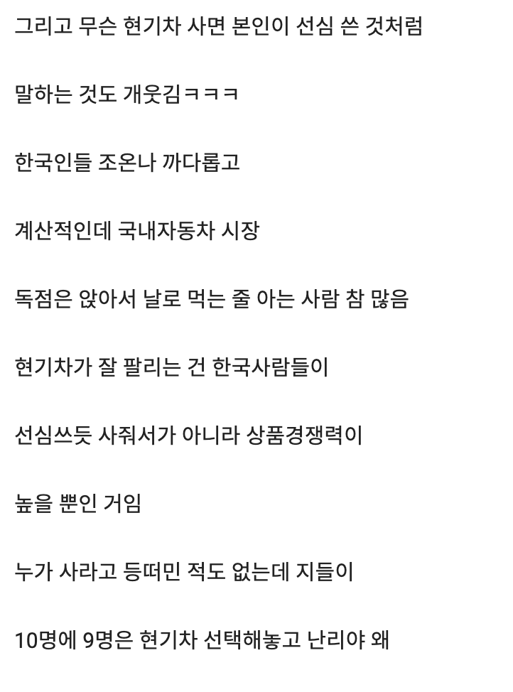 하이라이트는 "현기차가 잘 팔리는 건 한국사람들이 선심쓰듯 사줘서가 아니라 상품경쟁력이 높을 뿐인 거임"이라고 한 대목이다. 선심을 쓴 게 아닌 건 맞다. 누가 수천만 원짜리 차를 애국심, 선심으로 살까.