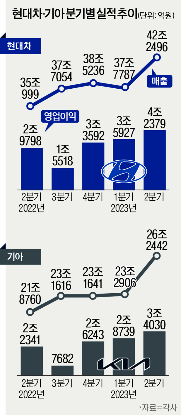 6일 현대차그룹에 따르면 2분기 현대차와 기아 영업이익은 각각 4조2379억원, 3조4030억원을 기록했다. 같은 기간 매출액은 42조2496억원, 26조2442억원이다.