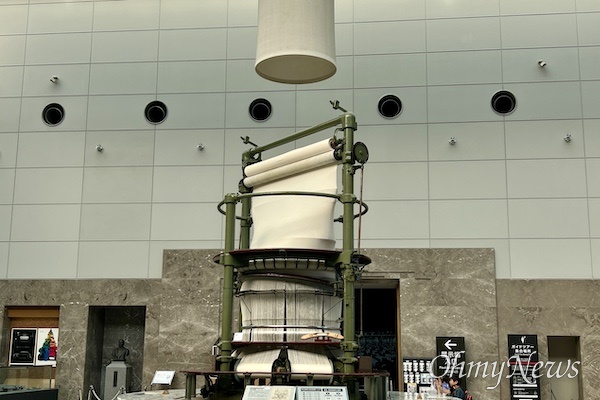 ▲ 도요타 산업기술 기념관 로비에 있는 원형직기. 일반 방직기는 평면으로 된 천을 생산해 필요에 따라 자르거나 붙여 제품을 만든다. 하지만 이 원형직기는 원통형 천을 이음매 없이 만들어 낸다. 1906년 도요다 사카치는 최소한의 공정으로 넓은 천 조각을 직조할수 있는 기계를 발명한 것. 전시된 제품은 1924년에 만든 것으로 현재도 가동된다. ⓒ 김종철