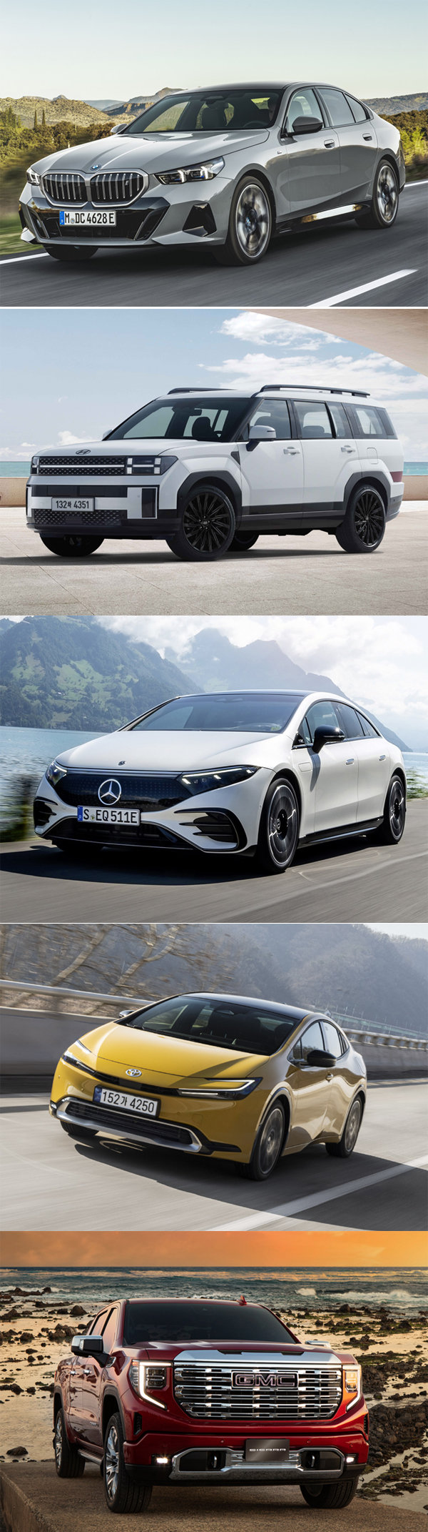 ▲올해의 전기 세단에는 BMW i5, BMW i7 M70 x드라이브, 메르세데스-EQE AMG ▲올해의 전기 SUV는 기아 EV9, KG 모빌리티 토레스 EVX, 메르세데스-EQE SUV ▲올해의 전기 크로스오버는 현대 아이오닉5 N, 기아 레이 EV, 폴스타 업그레이드 폴스타2가 경쟁한다.