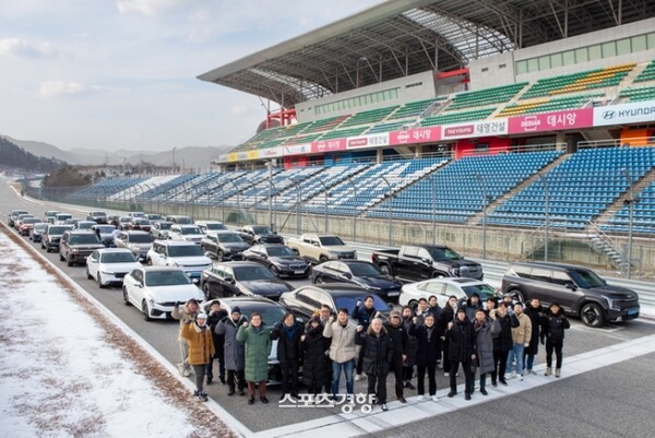 지난 23일 강원도 인제스피디움 서킷 위에서 ‘2024 대한민국 올해의 차(Car of the Year 2024)’ 후보작 모델들과 한국자동차전문기자협회 회원 기자들이 포즈를 취하고 있다. 사진 | 한국자동차전문기자협회